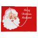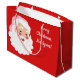 Mit dieser personalisierten Geschenktasche können Sie Weihnachtsgeschenke in stilvollem Ambiente genießen. Es enthält Ihre eigene, individuelle Botschaft und eine Vintage Abbildung des Weihnachtsmannes mit einem rosa Set aus der Weihnachtsmannmütze vor einem festlich roten Hintergrund.