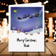 Der Weihnachtsmann segelt durch die Nacht in seinem magischen Schlitten, mit Rentier, der ihn leitet, macht eine lustige Weihnachtskarte, die Sie personalisiert machen können.