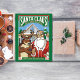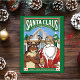 Dieses Weihnachtsdesign sieht aus wie ein alter Spielbrief oder ein Filmplakat, auf dem steht: "Der Weihnachtsmann und die Schaukelspielerin." Dieses Retro-Weihnachtsdesign hat einen Hintergrund mit einer Kirche, einem Weihnachtsbaum mit Schnee, und Schneeflocken fallen.