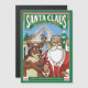 Dieses Weihnachtsdesign sieht aus wie ein alter Spielbrief oder ein Filmplakat, auf dem steht: "Der Weihnachtsmann und die Schaukelspielerin." Dieses Retro-Weihnachtsdesign hat einen Hintergrund mit einer Kirche, einem Weihnachtsbaum mit Schnee, und Schneeflocken fallen.