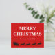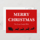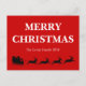 Diese Postkarte mit einer schwarzen Silhouette von Weihnachtsmann Ren vier auf den Sleigh reiten, der mit einer großen Tasche des Geschenks auf hellem rotem Hintergrund und weißer netter Text der frohen Weihnachten und der Familienname gefüllt wird, sendet eine warme süße nette liebevolle Ferienzeit-Grußmitteilung. Fertigen Sie sie besonders an, um sie speziell zu machen.
