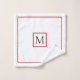Niedlicher Weihnachtsmann, Schneeflocken und monogramm Rotweihnachtsbadehandtuch-Set. Das Handtuch im Badezimmer ist mit einem großen Santa Claus in der Mitte auf rotem Hintergrund mit weißen Polka-Punkten, dem Handtuch ein Santa Claus-Muster auf weißem Hintergrund und dem Waschlappen roten Rand, Ihrem Monogramm und dem gleichen niedlichen Santa.