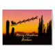 Eine Weihnachtskarte für Ihren Partner, die dem Weihnachtsmann zeigt, der über die Wüste fliegt. In der Silhouette sind viele große Kakteen zu sehen. Wünschen Sie ein frohes Weihnachtsfest aus der Wüste mit einer schönen Sonnenuntergang farbenen Karte.