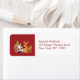 Eine niedliche Illustration mit dem Urlaubssinn. Der Weihnachtsmann trägt seinen Geschenksack und winkt hallo. Sein Rentierfreund an seiner Seite, an einem verzierten Weihnachtsbaum hängen, mit Geschenken überall herum. Set auf einem roten Hintergrund mit skurrilen Kreisen. Ein fröhliches und fröhliches Design.
