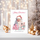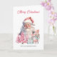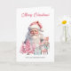 Auf der phantastischen Weihnachtskarte stehen ein Vintager Weihnachtsmann und ein Nussknacker unter Geschenken, die in blauem Papier mit rosa Weihnachtsbäumen verpackt sind
