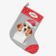 Die Vorderseite dieses Holiday Strumpfs zeigt ein Bild eines Beagle mit einer Weihnachtsmannmütze. Das Bild wird auf einem silbergrauen Hintergrund platziert, und die Zehe und die obere Grenze sind ein rot-weißes Schneeflockenmuster. An der oberen Grenze befindet sich ein weißes Etikett mit dem eigenen Text in dunkelgrau. Die Rückseite des Strumpfs ist das gleiche rote und weiße Schneeflockenmuster.