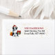 Die links Seite dieser lustigen Holiday Rücksendeadressen-Aufkleber zeigt ein Bild eines bezaubernden Schwarz-Weiß-Border Collie-Welpen, das eine rot-weiße Weihnachtsmannmütze trägt und vor verpackten Weihnachtsgeschenken sitzt. Ihr eigener Text ist rechts rot und schwarz. Ein subtiler goldener Konfetti-Hintergrund gibt ein wenig Weihnachtsfunkel.