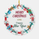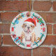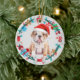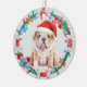 Auf der Vorderseite dieses Holiday-Ornament ist ein Bild eines niedlichen braunen und weißen Bulldog Welpen, der eine Weihnachtsmannmütze trägt. Der Hund ist umgeben von einem Weihnachtskranz aus eingewickelten Knochen, goldenen Sternen, Geschenkpackungen und Lichtern mit Streichquellen. Die Rückseite des Ornaments hat den gleichen Kranz mit benutzerdefinierten Text in rot, gold und grün. Ändern Sie das Jahr einfach in einen Namen, um es zu personalisieren, wenn Sie möchten.