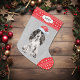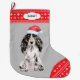 Die Vorderseite dieses Holiday Strumpfs zeigt ein Schwarz-Weiß-Cocker-Spaniel mit einer Weihnachtsmannmütze. Das Bild wird auf einem silbergrauen Hintergrund platziert, und die Zehe und die obere Grenze sind ein rot-weißes Schneeflockenmuster. An der oberen Grenze befindet sich ein weißes Etikett mit dem eigenen Text in dunkelgrau. Die Rückseite des Strumpfs ist das gleiche rote und weiße Schneeflockenmuster.