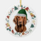 Hier ist ein wunderschönes personalisiertes Ornament für alle, die einen irischen Setter-Hund Lieben. Die Vorderseite hat einen schönen irischen Setter mit einer grünen und weißen Weihnachtsmannmütze. Das Bild ist in einem farbenfrohen Kreiskranz gerahmt, der aus verschiedenen Holiday-Bildern besteht, darunter ein Schneemann, Glocken, Bonbons, Strumpf, Heilige und vieles mehr! Auf der Rückseite des Ornaments befindet sich das gleiche Kranzbild mit dem eigenen Text in grün und rot.