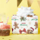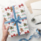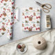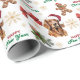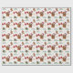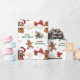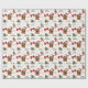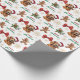 Das wiederholte Muster auf diesem Weihnachtspapier enthält ein Bild eines schönen Irish Setter Hundes, der eine rote und weiße Weihnachtsmannmütze trägt. Zum Muster gehören außerdem ein Lebkuchenmann, eine rote Schleife, ein Stechpalmenzweig mit roten Beeren und verschieden große, verzierte goldene Schneeflocken. Stilisierter roter und grüner Text sagt "FROHE WEIHNACHTEN" und "GLÜCKLICHES NEUES JAHR". Sehen Sie sich auch die passenden Geschenkanhänger in unserem Shop an.