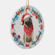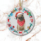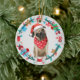 An der Vorderseite dieses Holiday-Ornaments steht ein Bild eines bezaubernden Mops-Hundes mit einer Weihnachtsmannmütze und einem Punkt Schal. Der Hund ist umgeben von einem Weihnachtskranz aus eingewickelten Knochen, goldenen Sternen, Geschenkpackungen und Lichtern mit Streichquellen. Die Rückseite des Ornaments hat den gleichen Kranz mit benutzerdefinierten Text in rot, gold und grün. Ändern Sie das Jahr einfach in einen Namen, um es zu personalisieren, wenn Sie möchten.