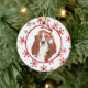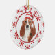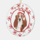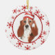 An der Vorderseite dieses Holiday-Ornaments befindet sich ein wunderschönes Aquarellbild eines bezaubernden Basset Hound Hundes mit einer rot-weiß gestreiften Weihnachtsmannmütze. Das Bild wird auf einem weißen Kreis gerahmt durch ein rotes Retro-Schneeflockenmuster platziert. Die Rückseite des Ornaments hat den gleichen Hintergrund und Kreis mit Ihrem benutzerdefinierten Text in Weiß auf einem passenden roten Hintergrund. Ideal für jemanden, der ein Basset Hound Liebe.