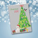 An der Vorderseite dieser Weihnachtskarte trägt ein bezaubernder West Highland White Terrier Hund eine Weihnachtsmannmütze, während er neben einem Holiday Baum sitzt. Britisch verpackte Geschenkpakete sind verstreut, und ein Stierstein landet auf dem Weihnachtsbaum. Der rote und grüne Text sagt "Christmas JOY". Inside ist stilisierter Text, der MERRY CHRISTMAS sagt, und ein Textfeld für Sie anpassen.