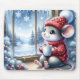 Eine gemütliche Maus in einem roten Pullover und ein Hut sitzt an einem mattierten Fenster mit einer Tasse heißen Kakao und bewundert eine schneebedeckte Landschaft mit Kiefern und Schneeflocken