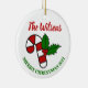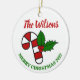 Dieses Weihnachtsschmuck sendet eine Nachricht an Ihre Framily und Freunde. Passen Sie es mit Ihrem Familiennamen und Ihrer persönlichen Nachricht an. Auf Vorder- und Rückseite ist das Ornament bedruckt.