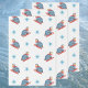 Vintage Illustration Frohe Weihnachtsfeiergestaltung mit einem niedlichen Retro-Wiederholmuster mit einem Jungen auf Schlitten oder Schlitten, der im Schnee spielt. Helle blaue Sterne sind überall verstreut.