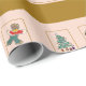 Niedliches Verpackungspapier mit einem Muster von Lebkuchenmännern, Weihnachtsbäumen und Schneemann auf einem rosa Hintergrund mit braunen Streifen.