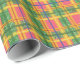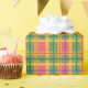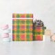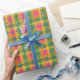 Ein grünes, rotes und glitzerndes weißes Weihnachtsmuster auf dem Verpackungspapier.