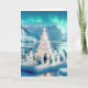 Pinguine versammeln sich um einen schön dekorierten weißen Weihnachtsbaum auf einer eisigen Floh, und das ätherische Licht des Nordlichts beleuchtet die verschneite Landschaft