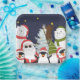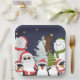 Papierteller mit quadratischem Design für den Weihnachtsfeiertag. Ein Bär legt einen Stern auf einen Weihnachtsbaum, der von seinen Freunden, Eisbären, Pinguinen und dem Weihnachtsmann umgeben ist.