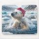Ein Eisbär, der eine rote Weihnachtsmannmütze trägt, spritzt spielerisch in eisigen Gewässern, umgeben von Gletschern