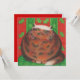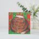 Eine fröhliche Tortoiseshollenkatze (wie ein Weihnachtskuchen!) sitzt auf einem grünen Kissen vor einem gemusterten Hintergrund aus rotem und grünem, heiliges Blatt. Einladung mit einem rot, grün und weiß anpassbaren Design für Sie zu personalisieren mit Ihrem eigenen Text, Bilder und Ideen. Ein origineller Bleistift, der von Jess Perry gezeichnet wird.