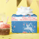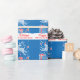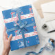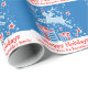 Weihnachten mit diesem einzigartigen niedlichen Rentiercharakter mit roter Nase in Weiß, Blau und Rot. Weihnachtsgeschenkpapier. Lest glücklichen Urlaub, mit Liebe aus. Passen Sie Ihren Familiennamen oder Ihre eigene Begrüßung und Nachricht an. Einzigartig illustriert und von Sarah Trett entworfen.