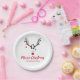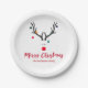 Ein lustiges, niedliches, modernes minimalistisches Bild eines Rentierkopfes mit roter Nase. Mit Weihnachtsschmuck, Bausteine hängen von den Antlers. Keine Hintergrundfarbe, Farben: weiß, rot, grau, blau, grün. Ein rotes, modernes handgeschriebenes Skript mit dem Text: Frohe Weihnachten. Vorlage für Ihren Familiennamen oder Text.