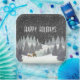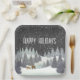 Pinienbäume in Schneeflocken mit Reh auf einem dunkelgrauen Winterhimmel. Die Himmelfarbe kann geändert werden. Text ist bearbeitbar.