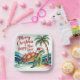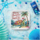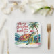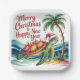 Eine skurrile Weihnachtsgrüßkarte mit einer fröhlichen Aquarellbilderin einer Meeresschildkröte, die eine festliche Weihnachtsmannmütze besticht und mit winkenden Weihnachtsbeleuchtung geschmückt ist, die um die Muschel herum aufgereiht ist, Set vor dem Hintergrund einer schwungvollen Palme, die ebenfalls mit warmen Lichtern und einem ruhigen türkisfarbenen Ozean beleuchtet. Die Muschel der Schildkröte ist mit feinen tropischen Blume in sanften Pastelltönen aus Korallen, Lavendel und Meeresfrüchten bemalt, während der Ozean mit subtilen Blauen und Silbergraden glänzt und so eine friedliche und dennoch feierliche Atmosphäre schafft. "MERRY CHRISTMAS & HAPPY NEW YEAR" erscheint in einem spielerischen, handgeschriebenen Schriftart oben auf der Karte, wobei das Interieur einen sauberen, weißen Raum für eine personalisierte Botschaft und ein subtiles, sich wiederholendes Muster kleiner Muscheln entlang der Unterseite bietet, um das tropische Thema zu verstärken. Der Ton ist leicht und fröhlich, ideal, um Freunden und Familie während der Ferienzeit warme Wünsche zu senden.
