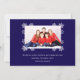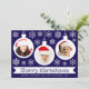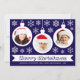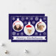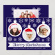 Eine Fotoweihnachtskarte für eine Familie mit Kindern. Sie hat 3 weiße Christbaumkugeln mit runden Fotos darin: ein Mädchen, ein Junge und ein Baby, alle mit roten Weihnachtsmannmützen. Die Christbaumkugeln sind von weißen Schneeflocken umgeben. Die Nachricht "Frohe Weihnachten" ist in einem weißen Schleifenrahmen geschrieben, darunter stehen die Namen in Großbuchstaben. Der Hintergrund ist dunkelblau.