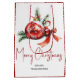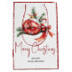 Weihnachtsschmuck mit rotem Bogen und Tannenzweigen Urlaub Mittelgeschenktasche. Es zeigt ein rotes Weihnachtsschmuck mit einem roten Bogen und Zweigen der Tanne und frohe Weihnachtstypografie. Die Seiten sind mit einem roten Muster mit weißen Schneeflocken bedeckt.