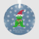 Niedlicher Weihnachtsfrosch, der Bonbons hält und eine Weihnachtsmannmütze trägt, umgeben von Schneeflocken. Fügen Sie einen Namen und eine kurze Meldung auf der Vorder- und Rückseite ein.