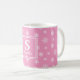Moderne Vektormuster von weißen Schneeflocken auf rosa Hintergrund kennzeichnen diese festliche Tasse. Dieses Winterdesign verfügt auch über ein Monogramm, das mit Ihrem eigenen Initial und Namen personalisiert werden kann.