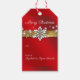 Hübsches Urlaubsetikett für alle Geschenkwünsche. Hellrotes Satin mit Schneeflocken, hellen Sternen, Goldsatin und glänzenden Diamanten.