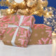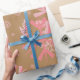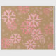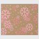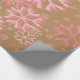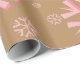 Dieses Weihnachts-Weihnachtsverpackungspapier ist auf einem Tan-Hintergrund mit Schneeflocken in verschiedenen Größen von super groß bis kleiner in einer weichen warmen Carnation Pink und Blassrosa gezeigt. Auf glänzendem Papier.