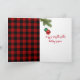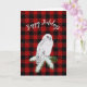Schneeeule auf der Winterkiefer mit Schneeflocken auf rotem und schwarzem Büffel kariertem Hintergrund. Text ist bearbeitbar.
