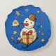 Ein niedlicher Schneemann auf einem Schlitten mit einem Geschenk, einem kleinen Brief und Weihnachtsdekorationen.