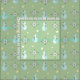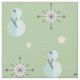 Dieses moderne Retro-Muster aus der Mitte des Jahrhunderts mit abstrakten Schneemännern, Schneeflocken und Sternen, in Vintagen hellblauen und gelben Farbtönen vor einem verblassten grünen Hintergrund.