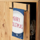 Schneemann auf einem weißen Teller mit weißem Weihnachtstext und Silbergeschirr mit blauem Hintergrund und Schneeflocken. Die Hintergrundfarbe kann geändert werden.