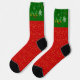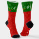 Fantastische Weihnachtssocken mit Schneeflocken auf Rot mit dem Text "Ho Ho Ho" des Weihnachtsmanns über dem grünen Streifen. Wintermode Socken für Weihnachten Party, Secret Santa und die besondere Festzeit des Jahres.