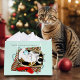 Eine chubby calico Katze ist in einer geöffneten Weihnachtsschachtel mit Spielzeug und ist glücklicher mit der Schachtel, in die das Spielzeug kam.