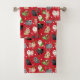 Niedliche Weihnachtshunde in festlichen Urlaubssälen. Spitz mit Creme, Schwarz, Bräune, Grau und Schokolade-Kleider tragen Weihnachtsmannmützen, Geweih, Pullover auf einem roten Hintergrund mit verstreuten Ziergegenständen Bad Handtuch Set.