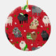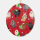 Niedliche Weihnachtshunde in festlichen Urlaubssoutien. Spitz mit Sahne, Schwarz, Bräune, Grau und Schokolade-Kleider tragen Weihnachtsmannmützen, Geweih, Pullover auf einem roten Hintergrund mit verstreuten Ziergegenständen.