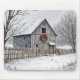 Eine rustikale Scheune ist mit einem festlichen Weihnachtskranz vor dem Hintergrund leicht fallender Schnee geschmückt