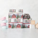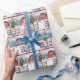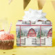 Wasserfarbene Scheune mit Schneemann, Weihnachtskranz und alter Zaun in Schneeflocken.