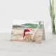 Rot-Weiß-Weihnachtsmannmütze auf Seestern mit einer Flasche im Strand Sand für Weihnachtsfeiertage Gruß