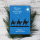 Christliche Weihnachtskarte mit klugen Männern und Schrift über den Stern. Blauer Nachthimmel mit funkelnden Sternen und einem großen Stern. Die drei weisen Männer auf Kamelen sind in schwarzer Silhouette. Der weiße Text oben lautet: "Als sie den Stern sahen, waren sie überglücklich" aus dem Buch Matthew 2:10 NIV Version. Fügen Sie eine Signatur unten auf der Karte hinzu.