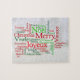 Eine farbenfrohe rot-grüne Wortwolke froher Weihnachtsgrüße in vielen Sprachen der Welt vor einem Hintergrund weißer Feriendekorationsschmuck, Baumzweige und Schnee ist ein fröhlicher Ausdruck des Willkommens an alle. Die besten Weihnachtstidings an Ihre und Ihre.